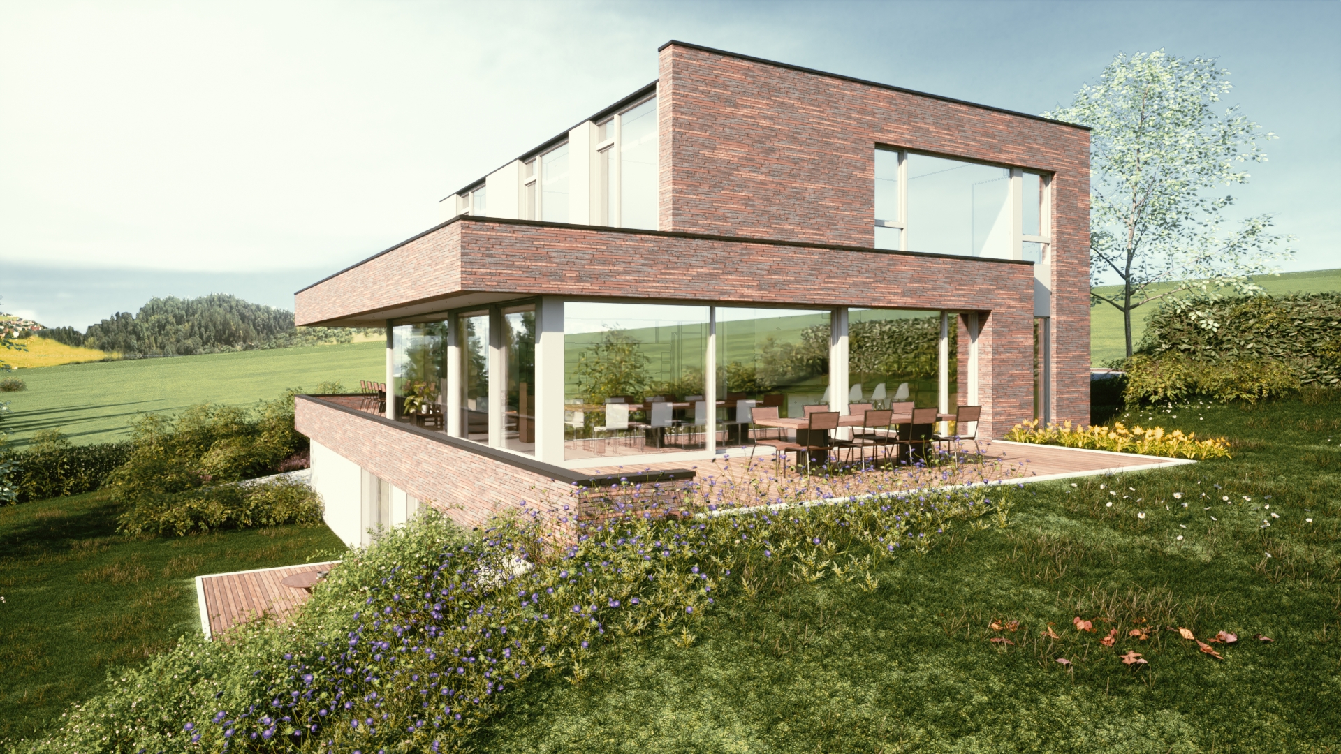 Conçue pour s'intégrer harmonieusement à la pente naturelle du terrain, cette maison offre un accès direct au jardin depuis tous les niveaux, favorisant ainsi une connexion fluide avec la nature environnante. L'utilisation réfléchie de briques allongées de 60 cm confère à la structure une horizontalité distinctive, lui permettant de s'ancrer solidement dans le paysage malgré ses multiples niveaux.